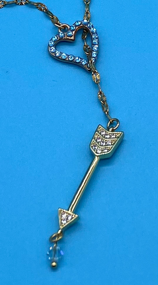 The heart is adorned with shimmering blue Swarovski crystals, capturing the light with every movement, while the gold-plated arrow is embellished with sparkling cubic zirconia for added brilliance. A single blue Swarovski crystal accents the arrowhead, creating a striking focal point.