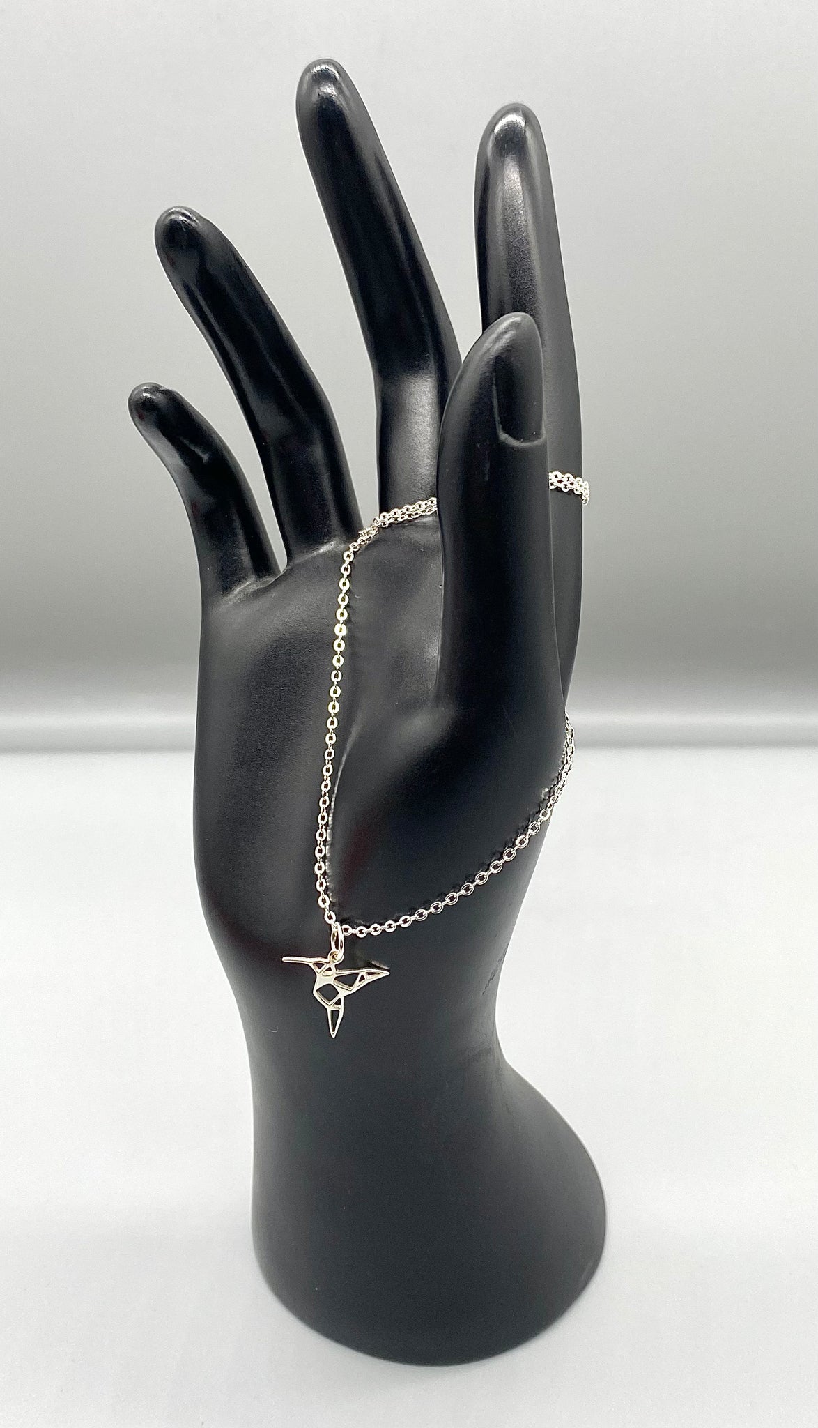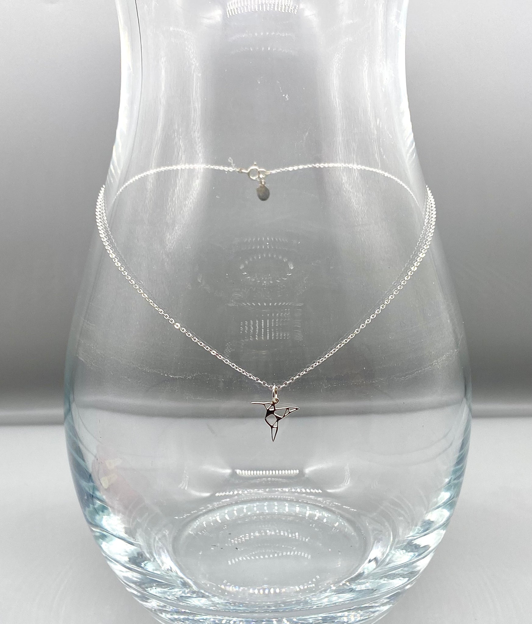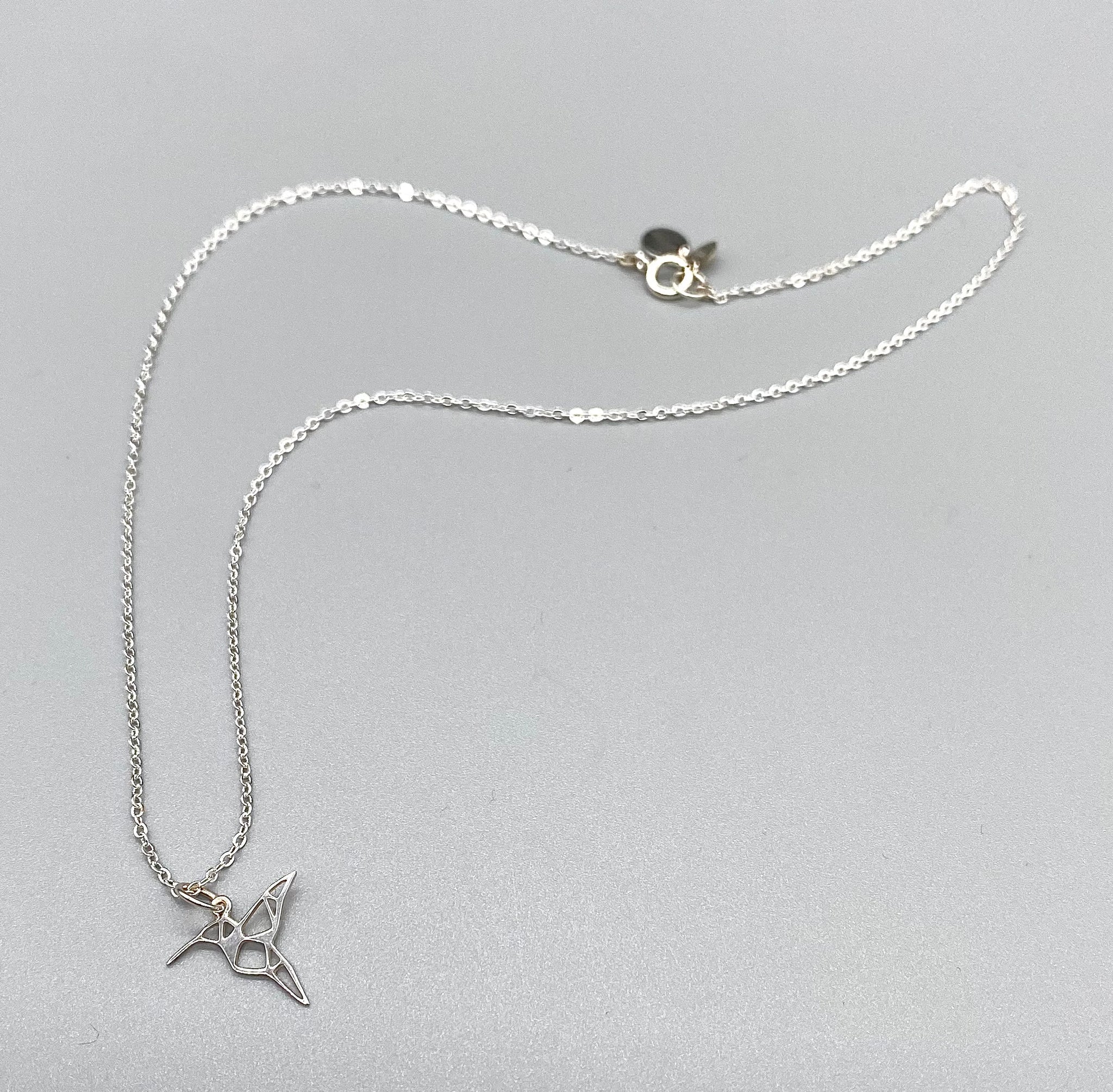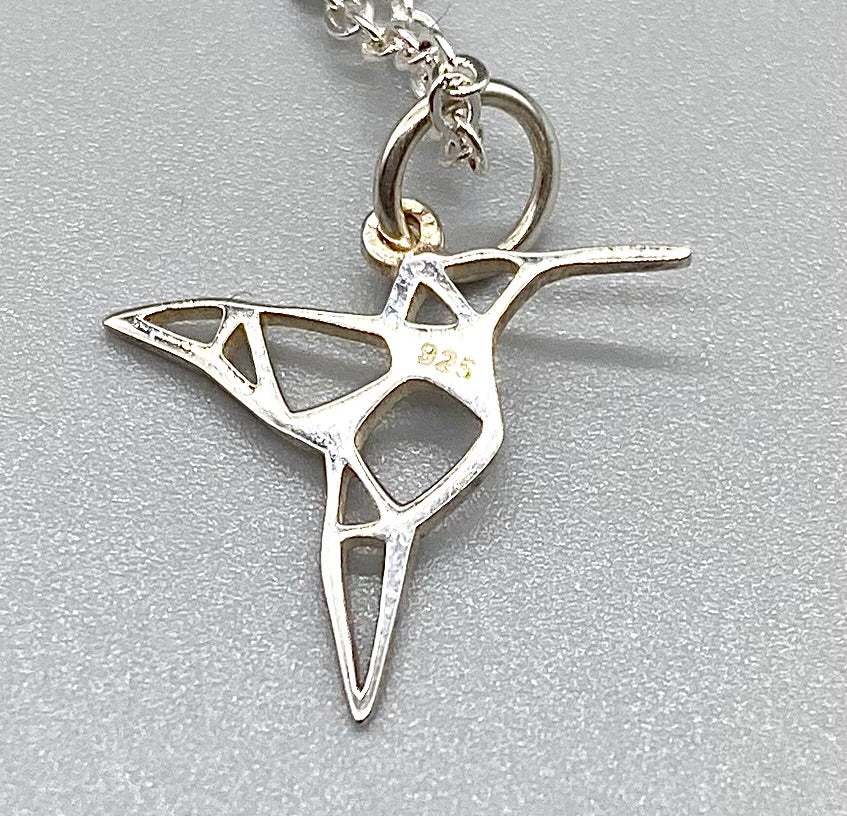 This beautiful necklace showcases an origami style hummingbird, simple yet elegant.