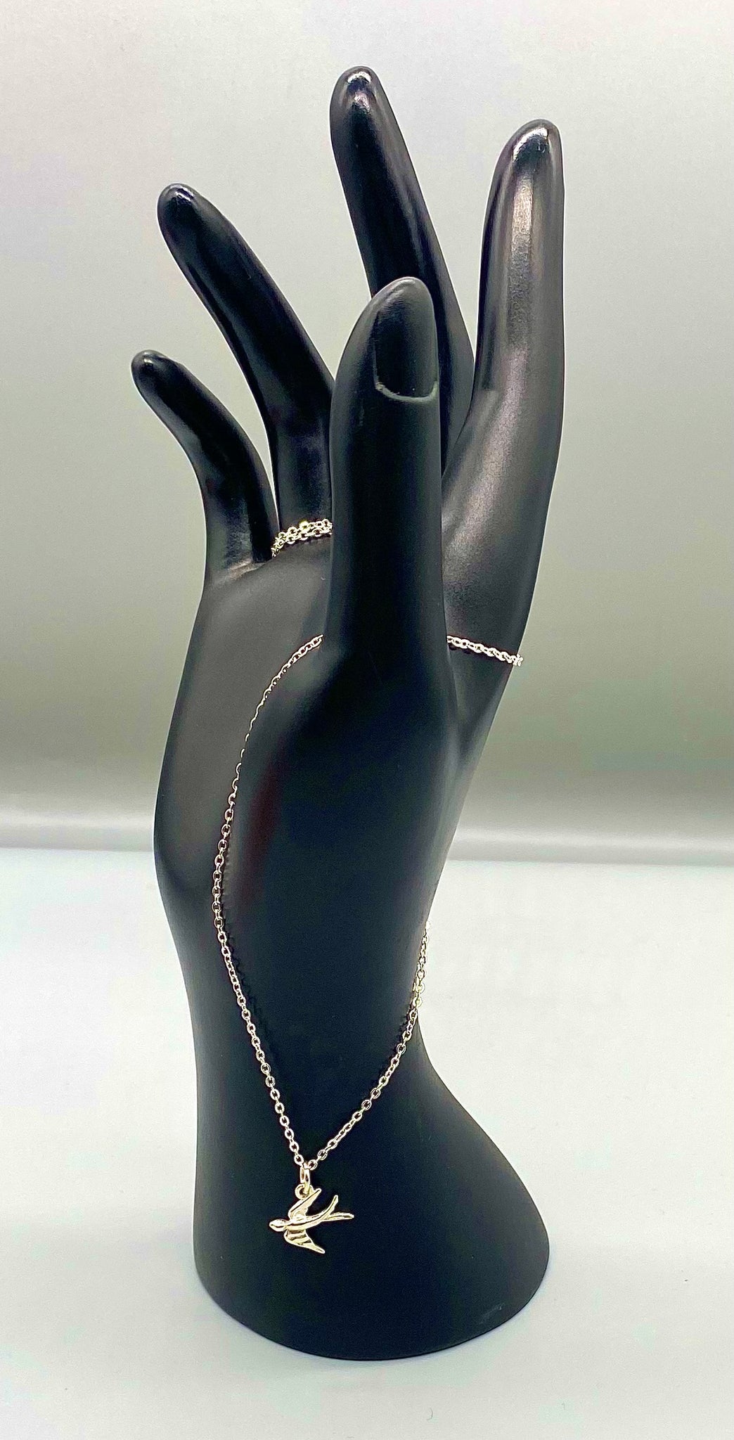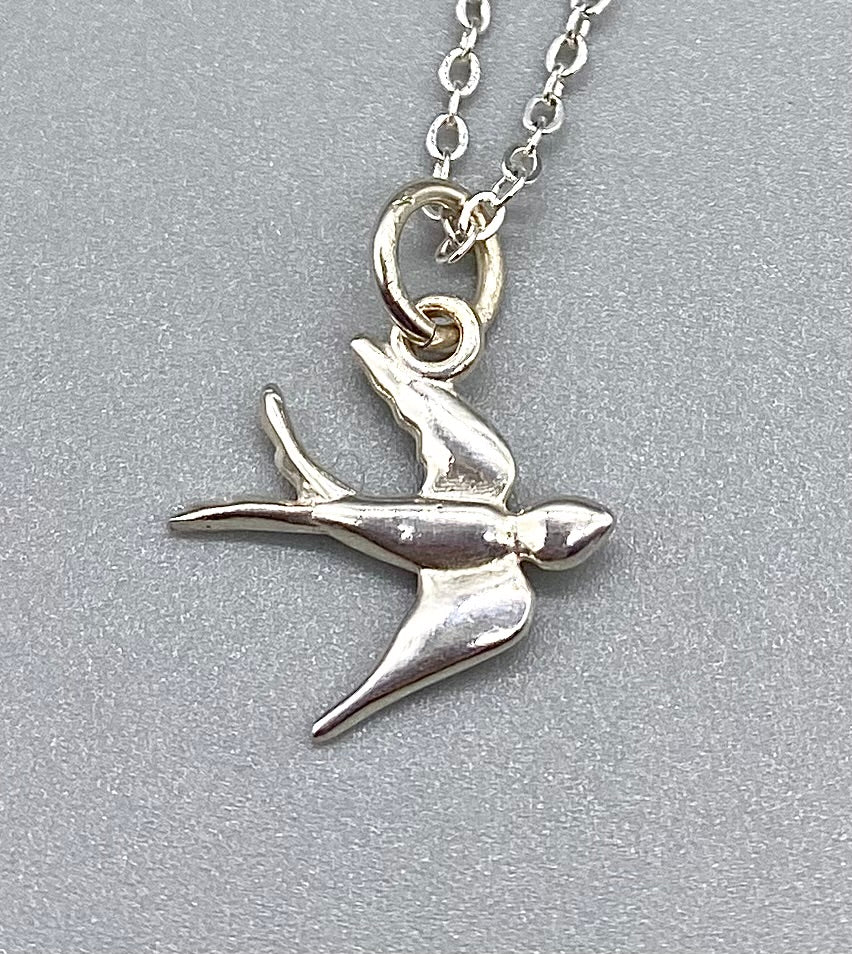 This necklace features the swallow, a bird which symbolises love, loyalty and luck.