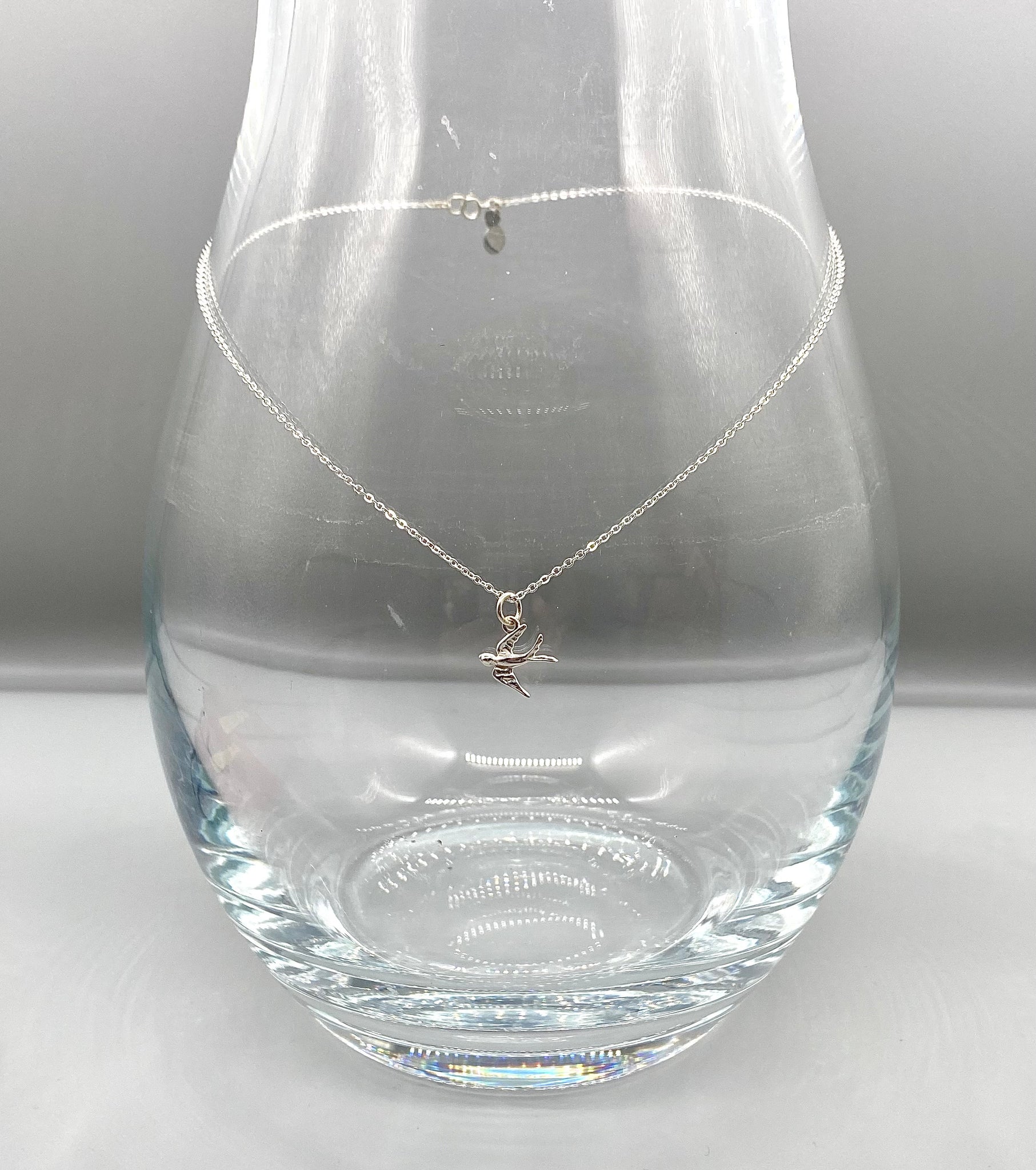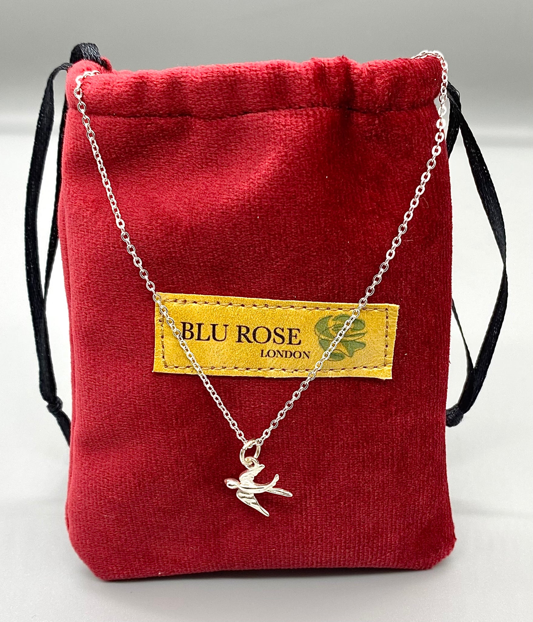 The sterling silver swallow hangs off a silver plated flat cable chain and comes with sterling silver fastenings, a spring ring clasp and Blu Rose branded tag.