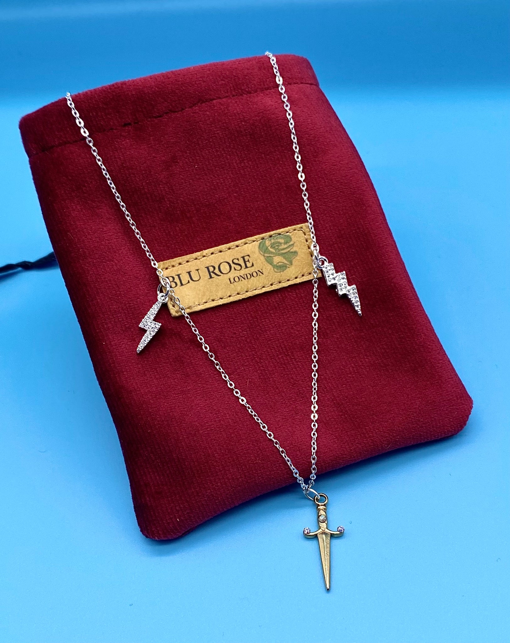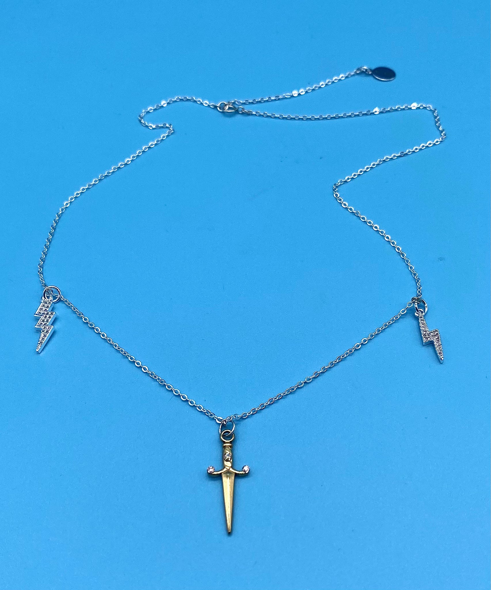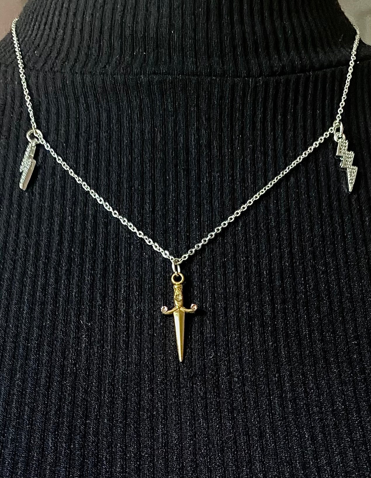 This necklace carries "warrior-chic" energy. The sharp clean lines of the dagger mixed with the lightning bolts, give an empowering feeling that is perfect for someone who loves jewellery with a bit of edge.