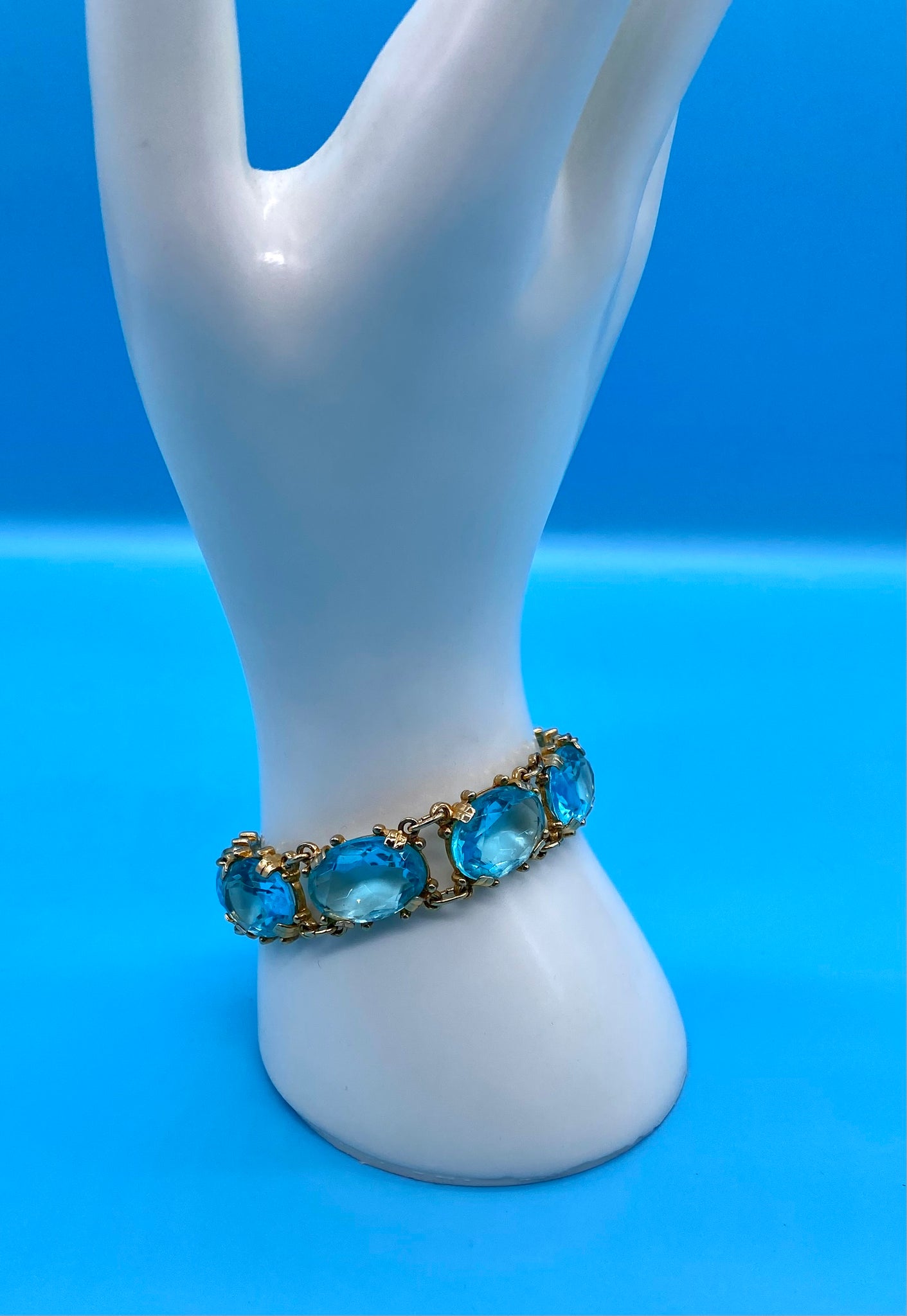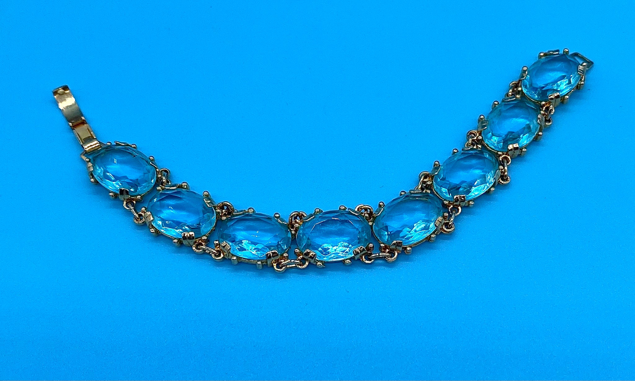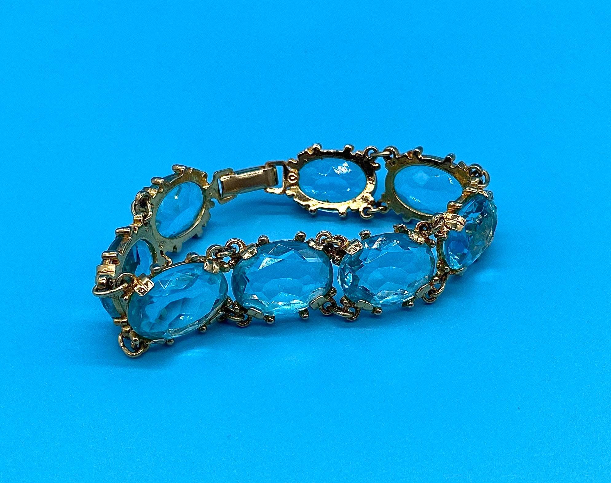 The bracelet is linked with beautiful large faceted crystal gems in a stunning shade of pale blue all within a plated gold setting. It has a clip clasp fastening.