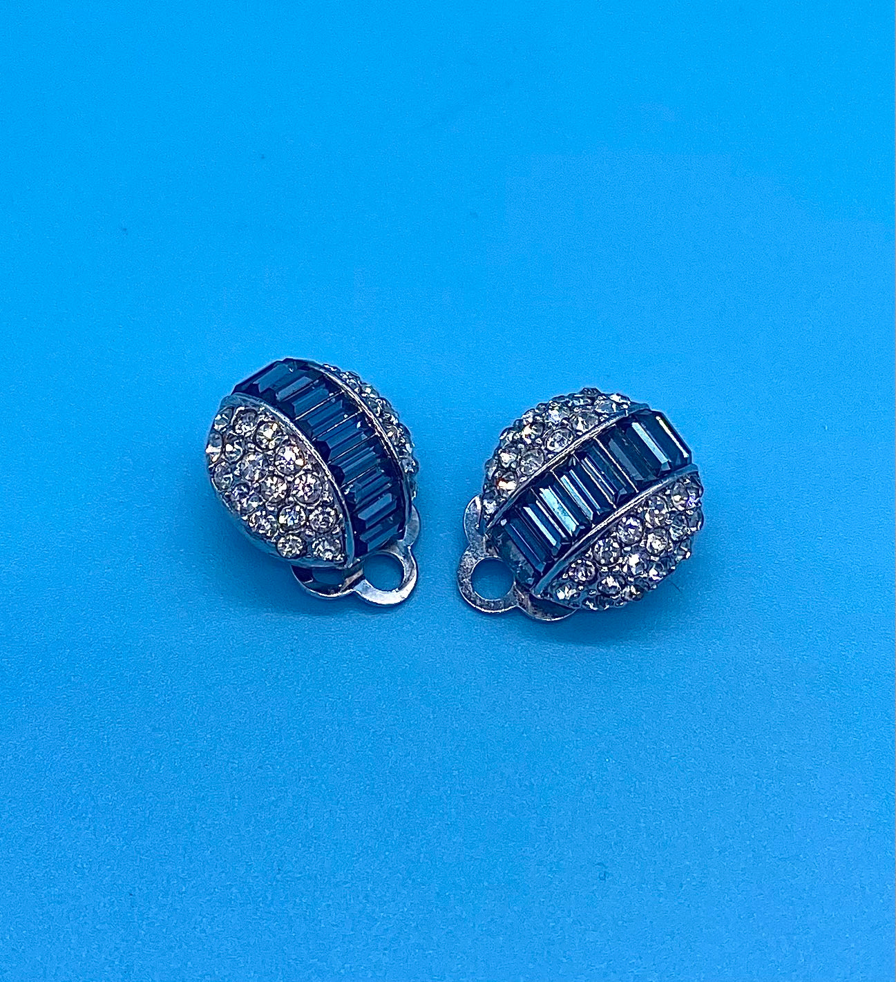 The rounded earrings feature blue baguette crystals set amongst sparkling rhinestones. The stones are set in a Silver tone metal setting. At a later period (1990's) Christian Dior showcased earrings in a very similar design.