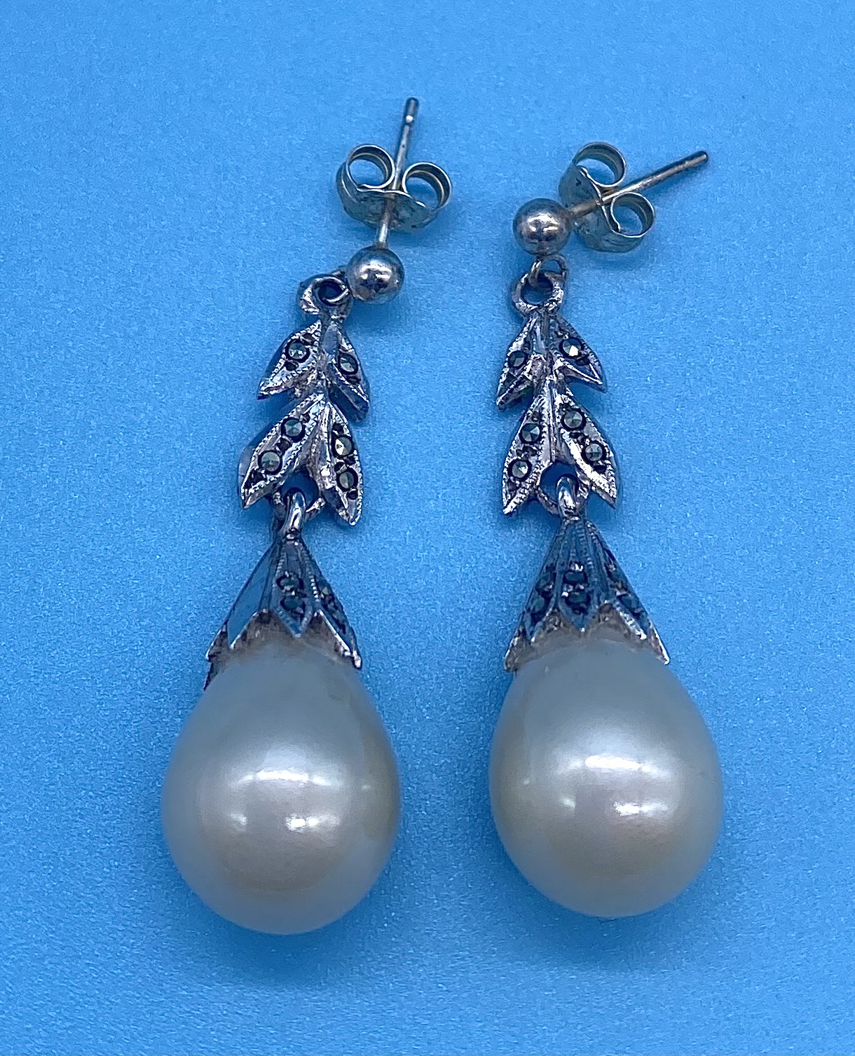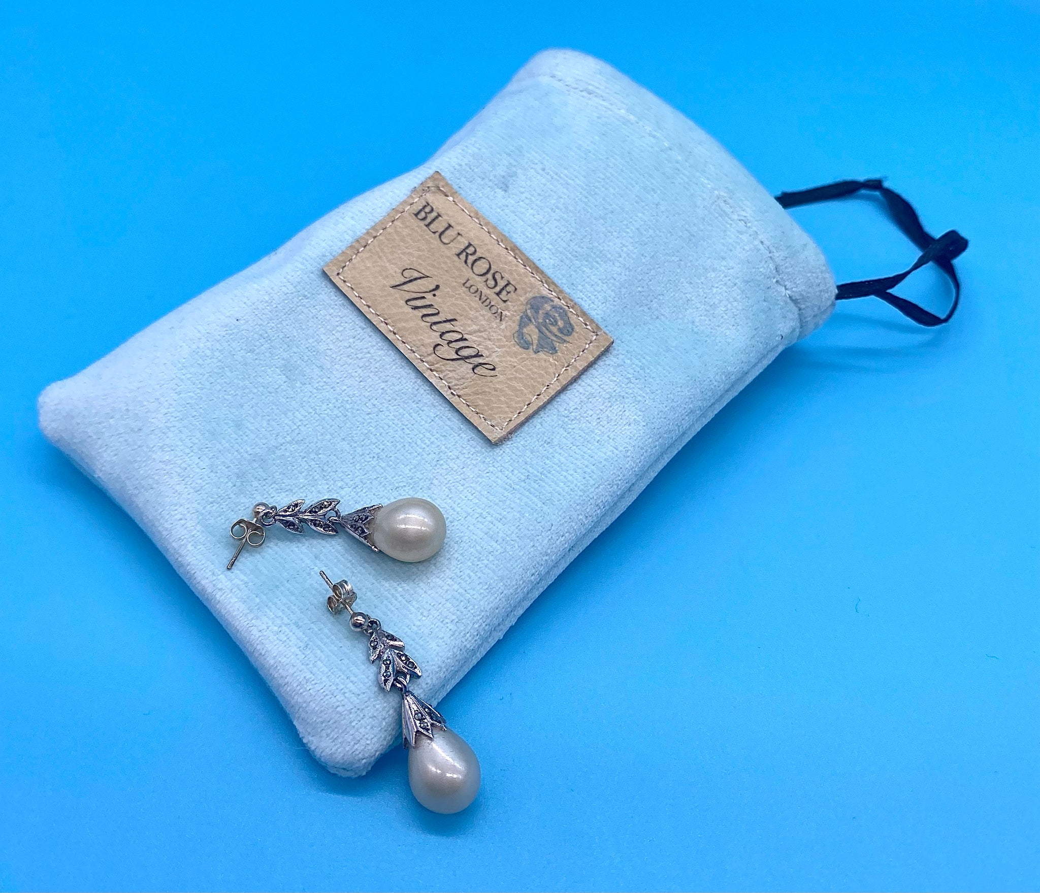 These pearl drop earrings have been adapted by Blu Rose by adding a modern sterling silver stud and butterfly back fitting. The high quality faux pearl is encased in a silver toned leaf design with tiny rhinestones.