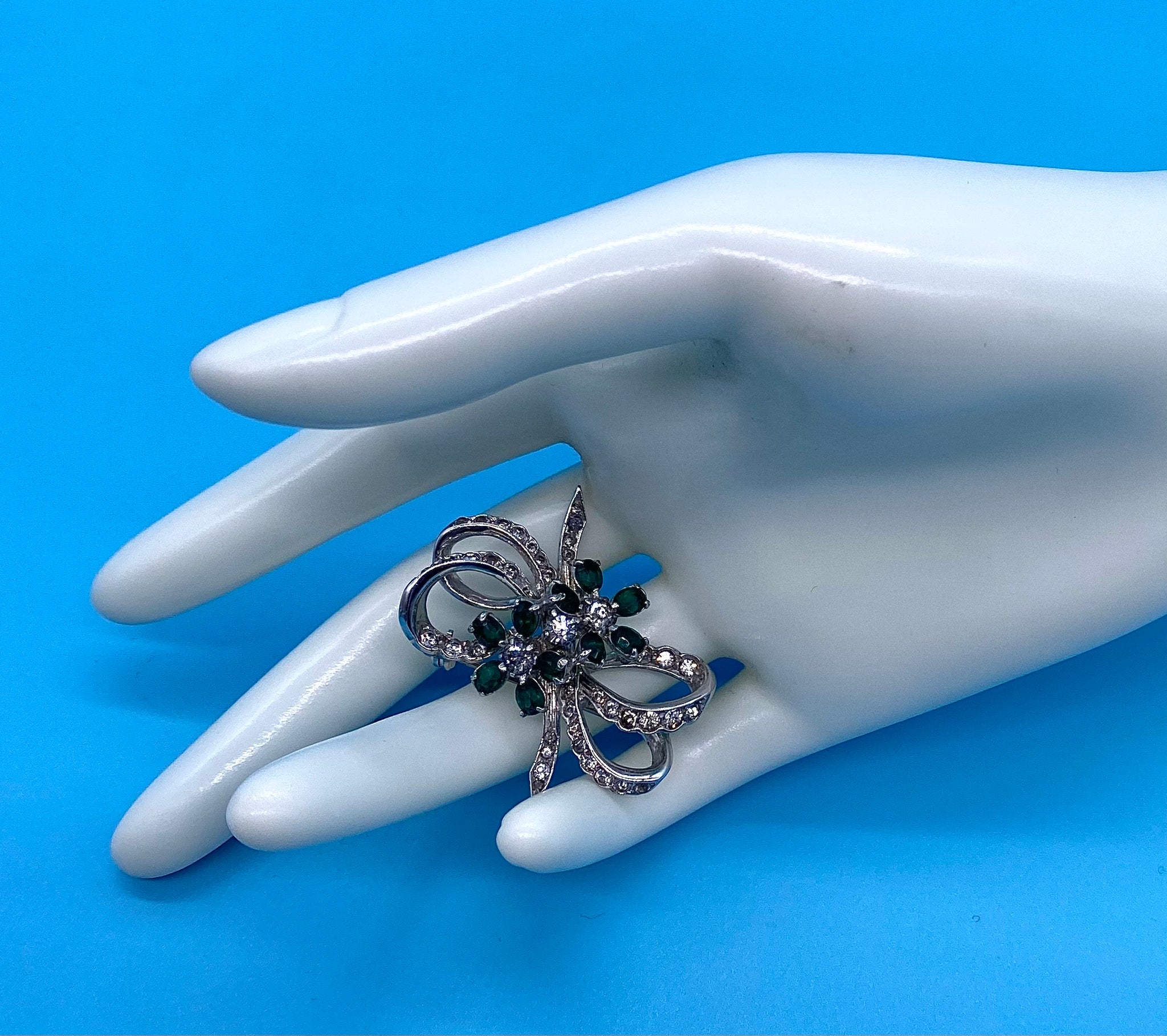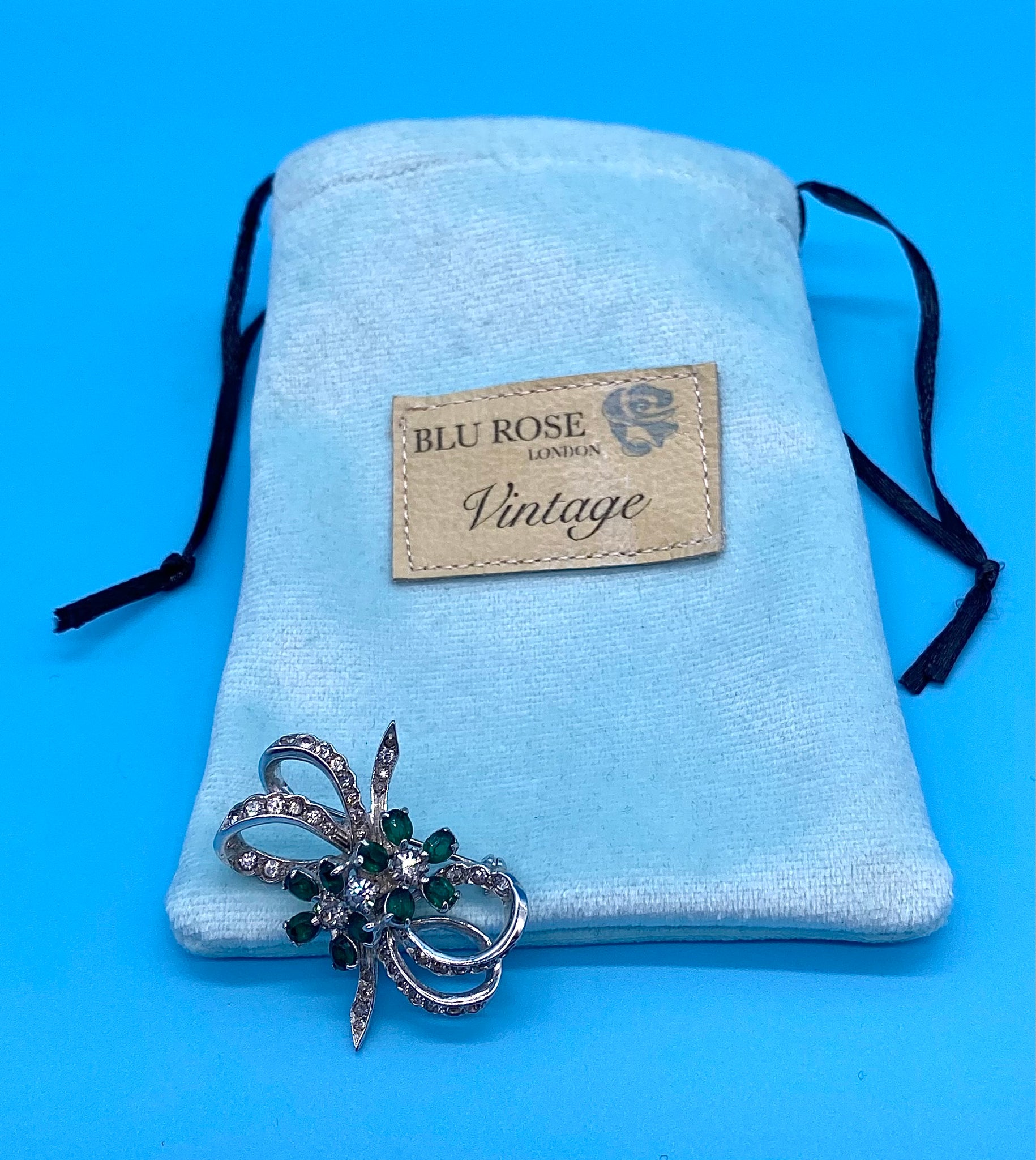 The bow part of the brooch is covered in clear crystal rhinestones with the petals of the flower set with emerald green and clear crystals which gives the brooch a dazzling sparkle, all set within a rhodium plated base. The fixture is a roll over safety catch pin.