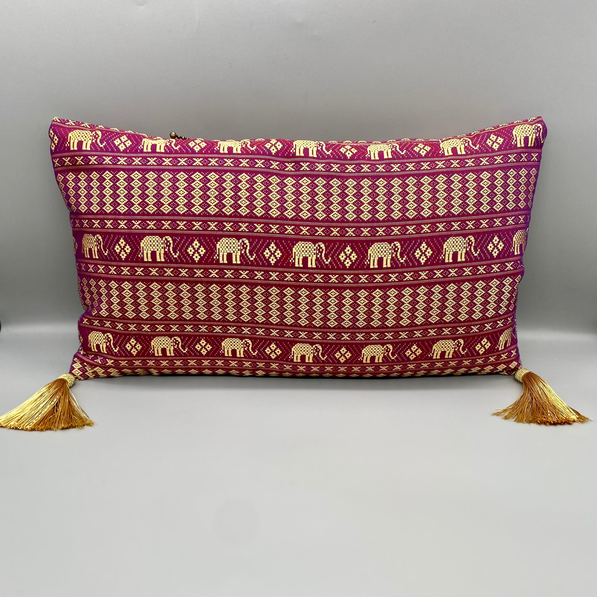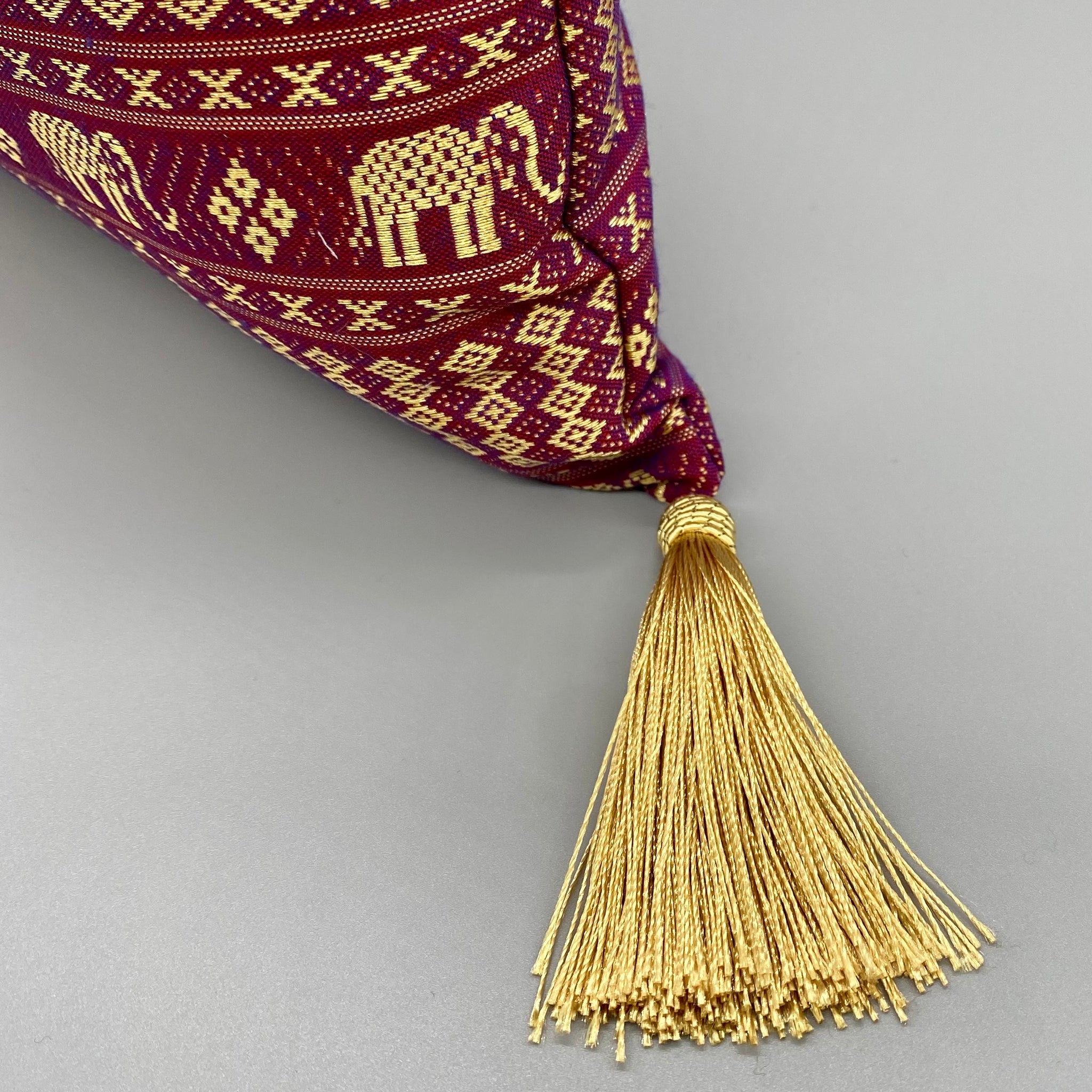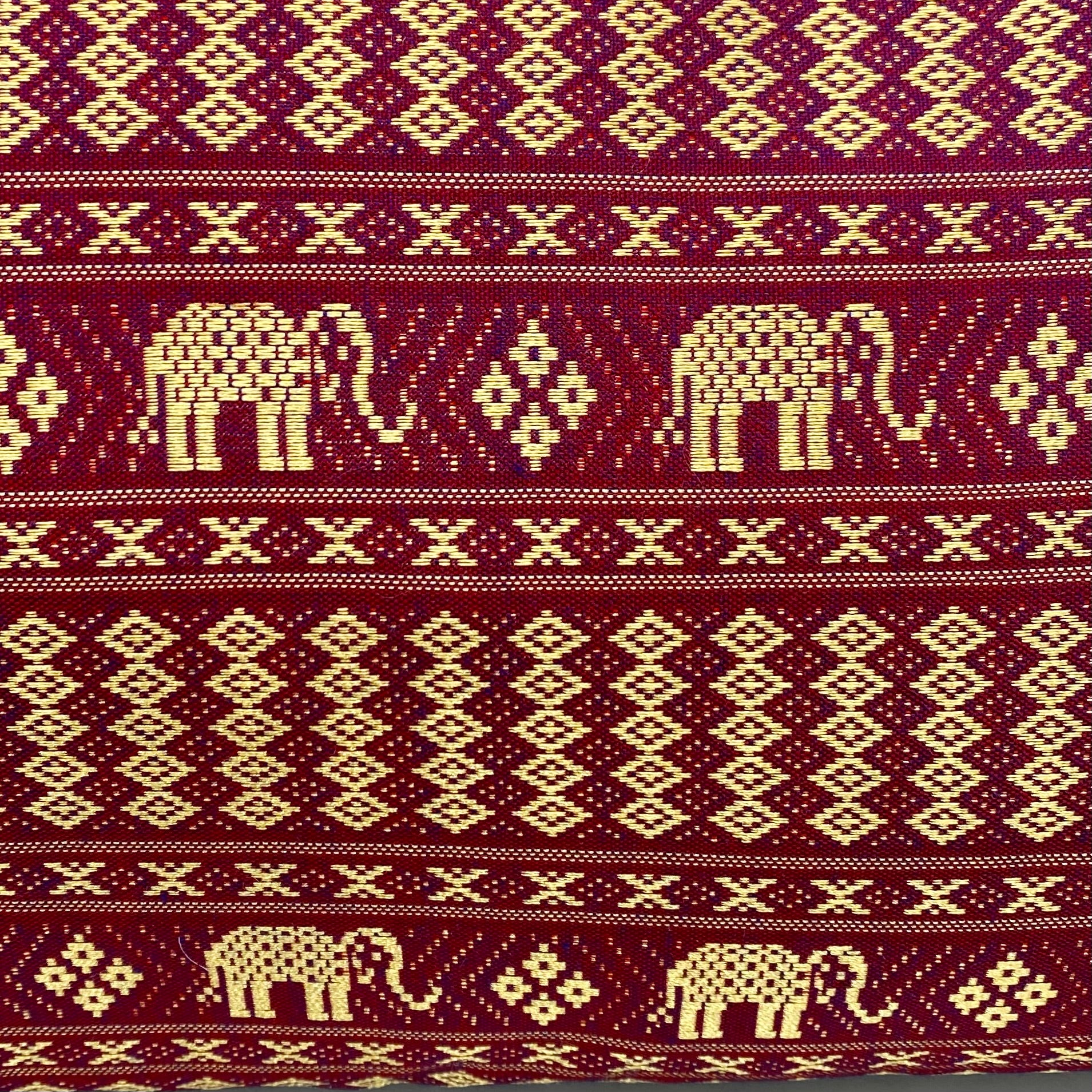 It is cut from a stunning vintage silk throw and has 2 gold silky tassels attached to the bottom corners. The gold elephants are vibrant throughout the print set against a beautiful shade of rose garnet.