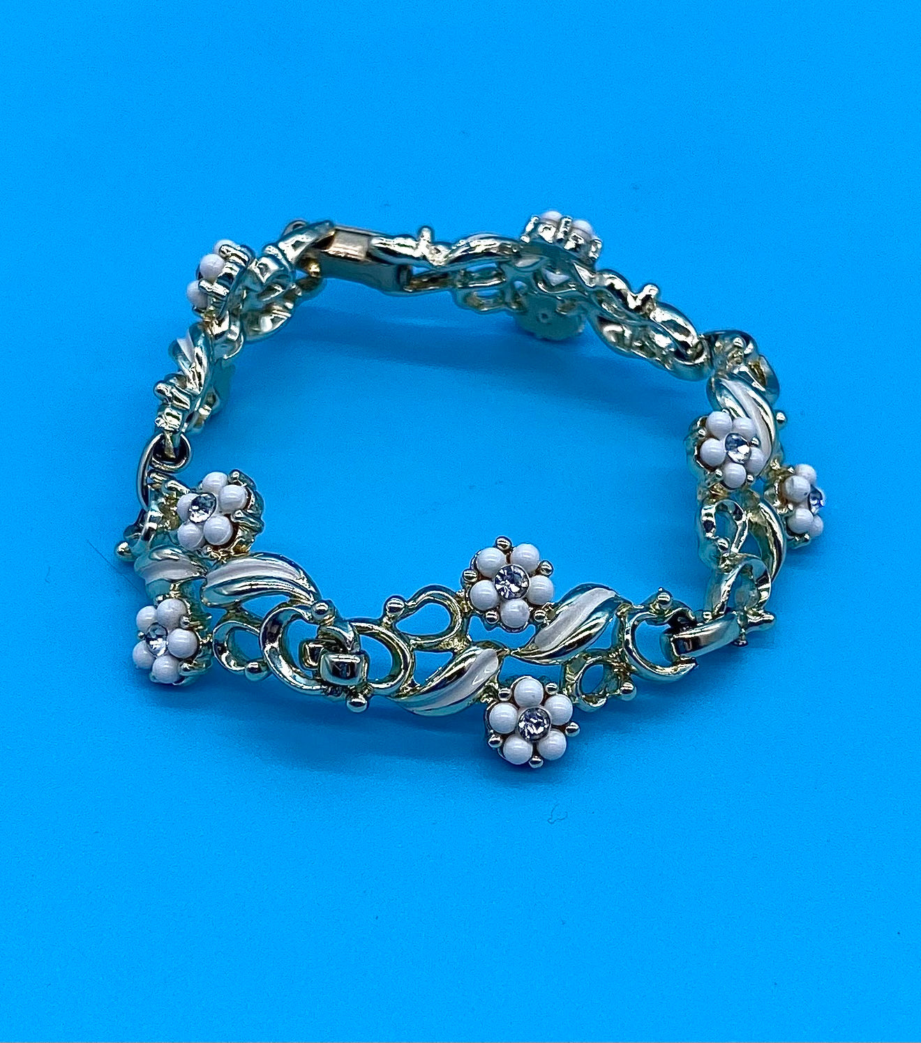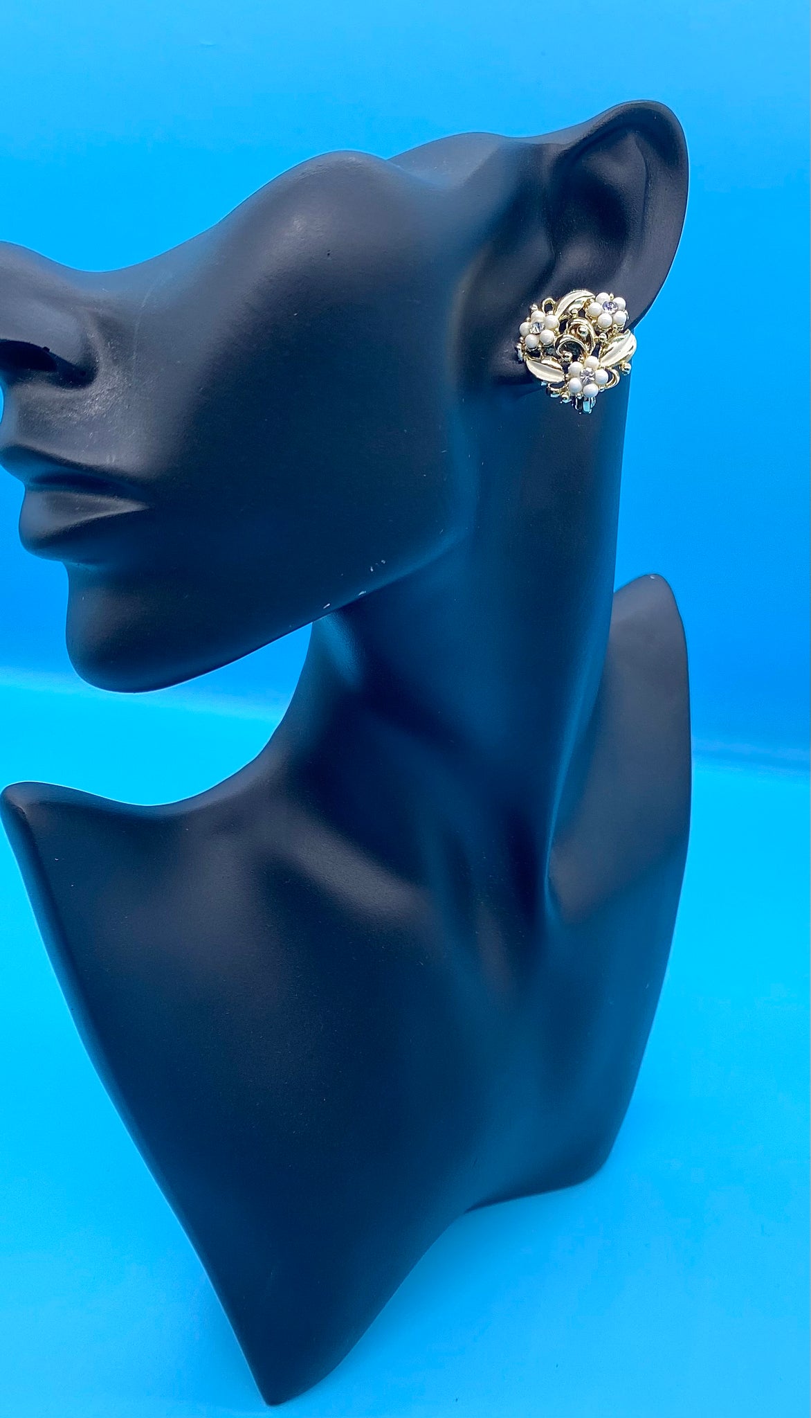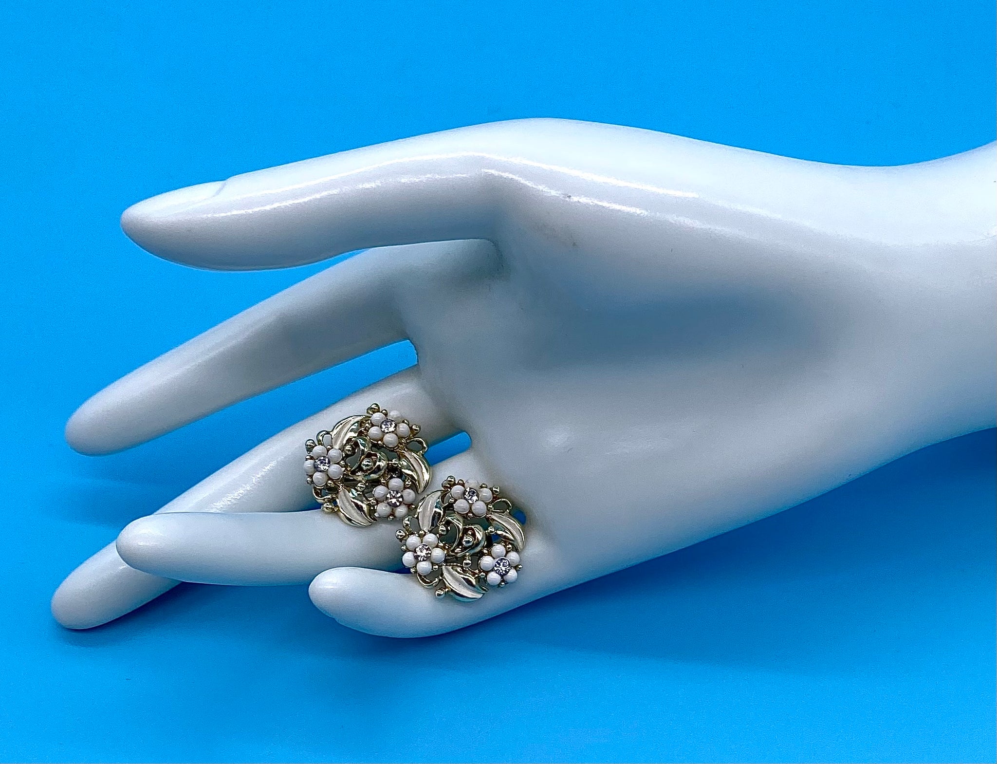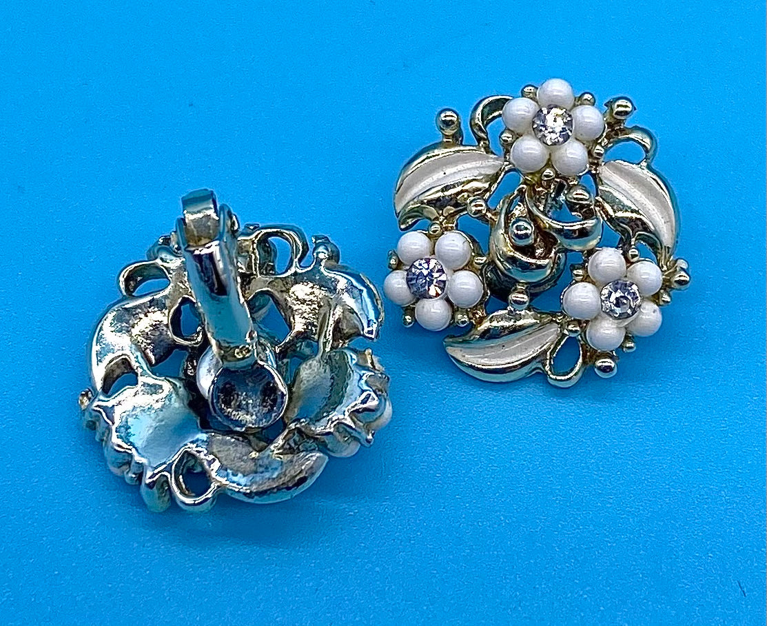 These cluster earrings feature tiny milk beads and crystals set in a silver tone finish, which form a floral design which was very popular in the 1940's and 1950's. The back of the earrings show the Jewelcraft stamp.