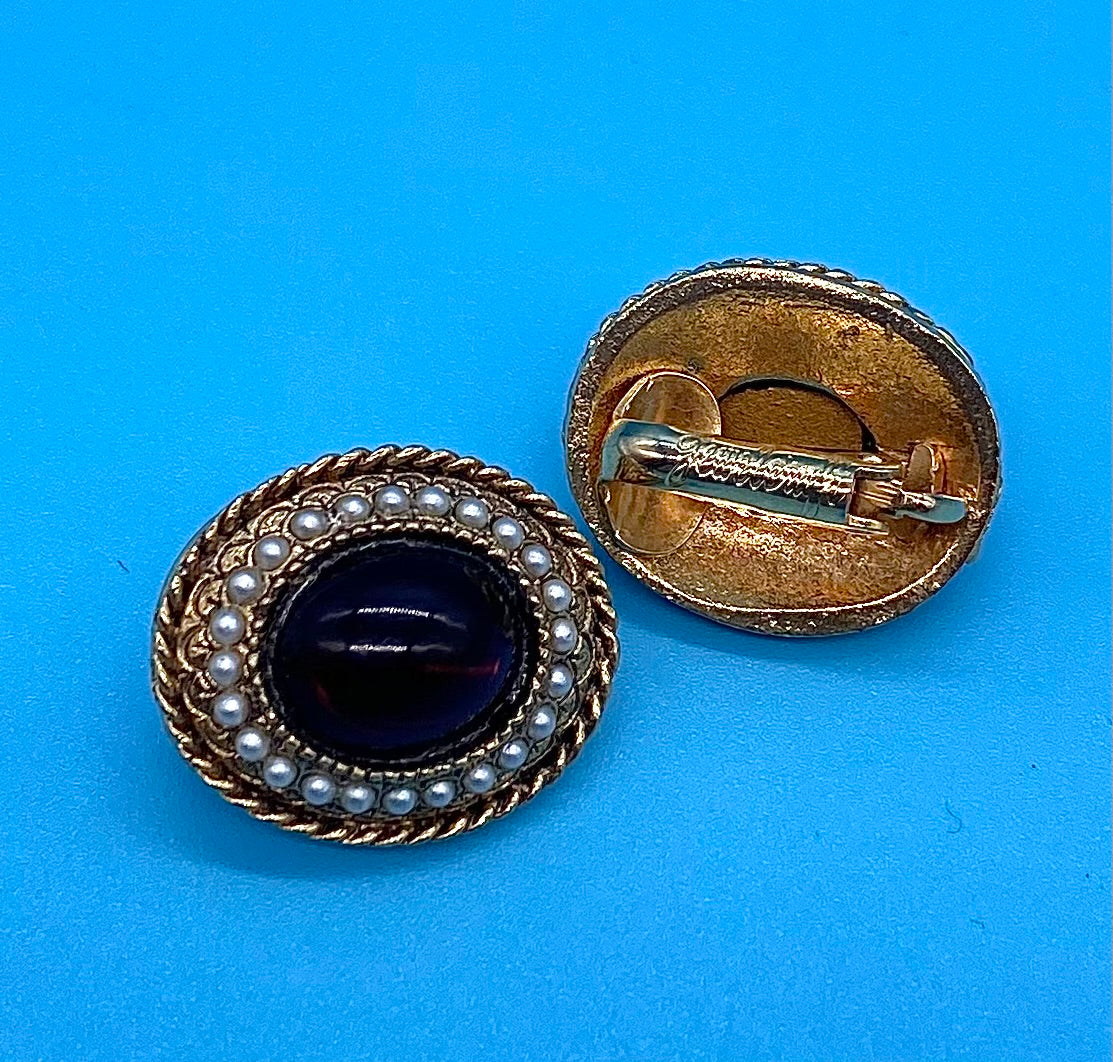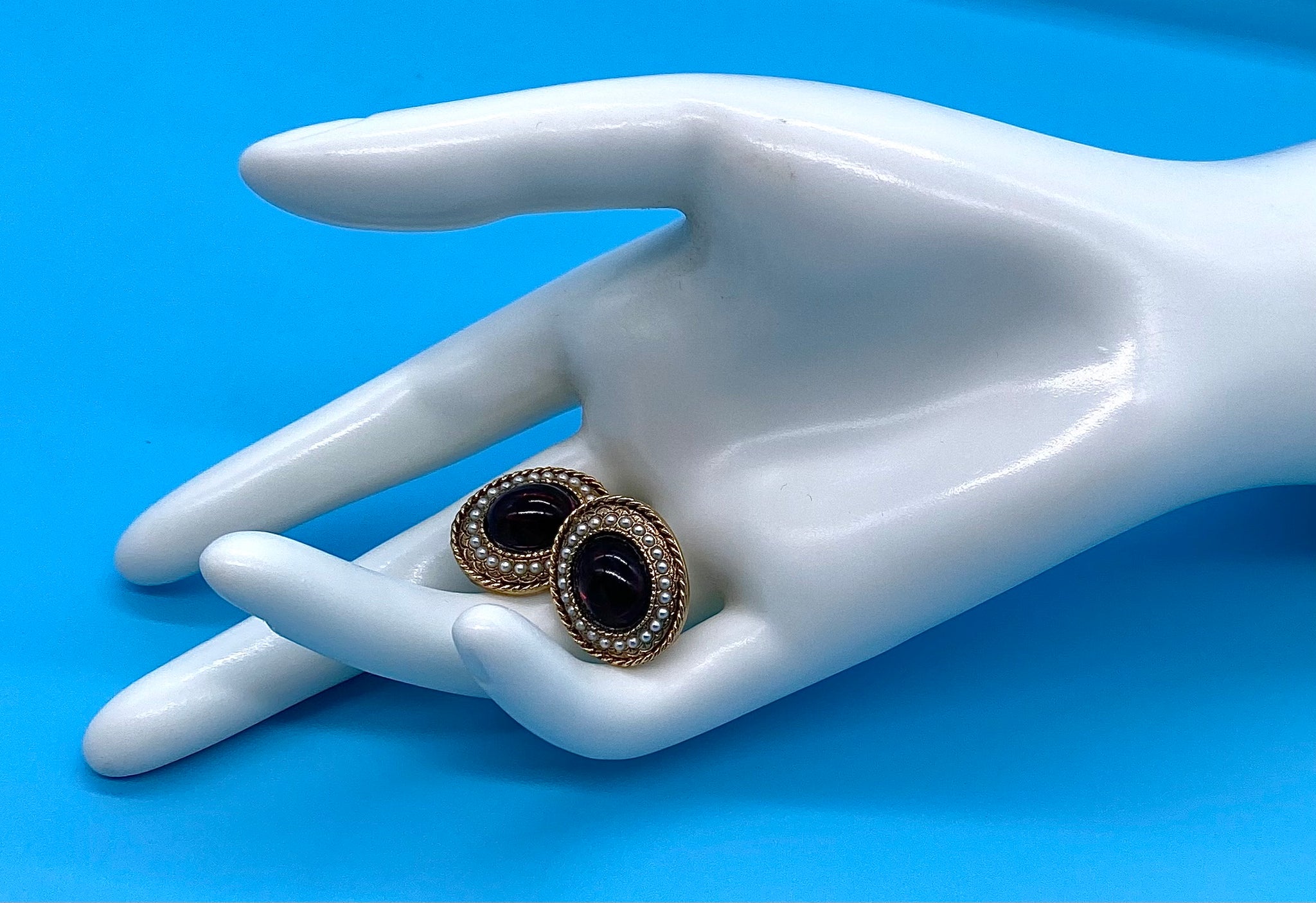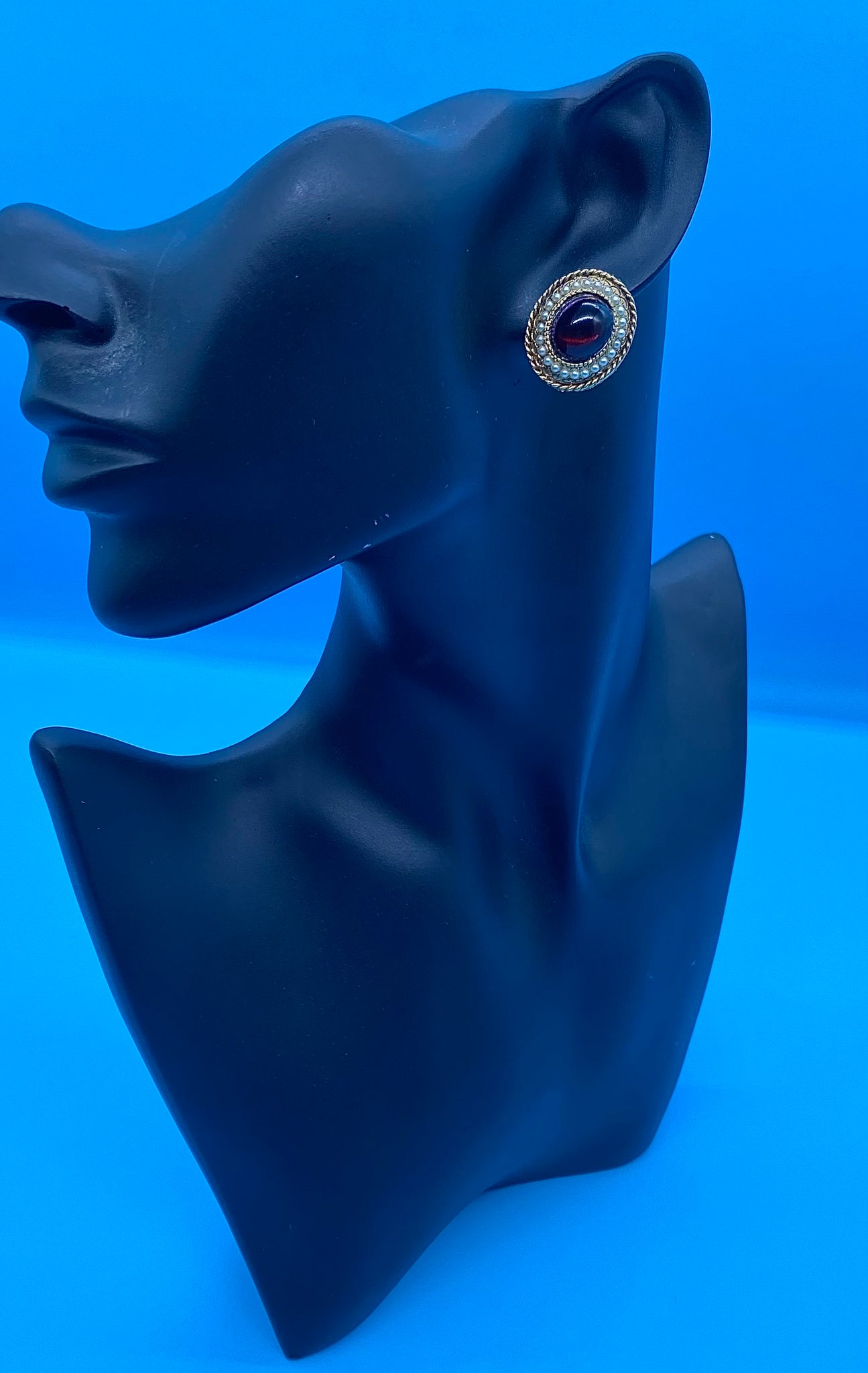 The oval earrings feature a red cabochon stone surrounded by seeded pearls set in a gold tone setting. The back of the earrings show the jewelcraft stamp.
