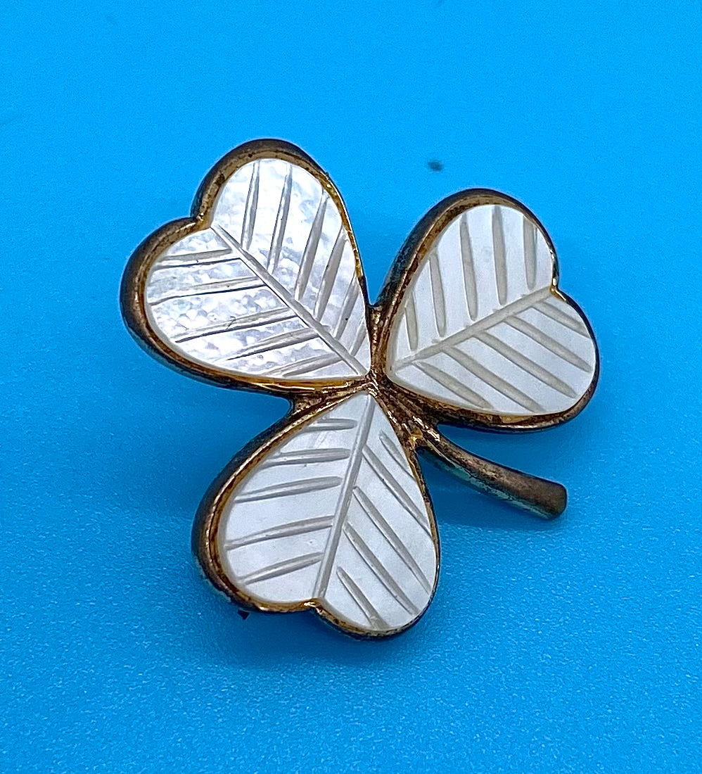This three leaf clover brooch which can also be referred to as a shamrock, is a traditional Irish symbol of good luck. The leaves are made of carved mother of pearl which gives them a white, iridescent and ridged appearance. The frame and stem are of a gold tone metal and it has a roll over safety catch pin fixture.