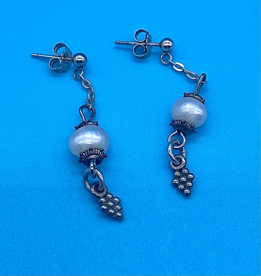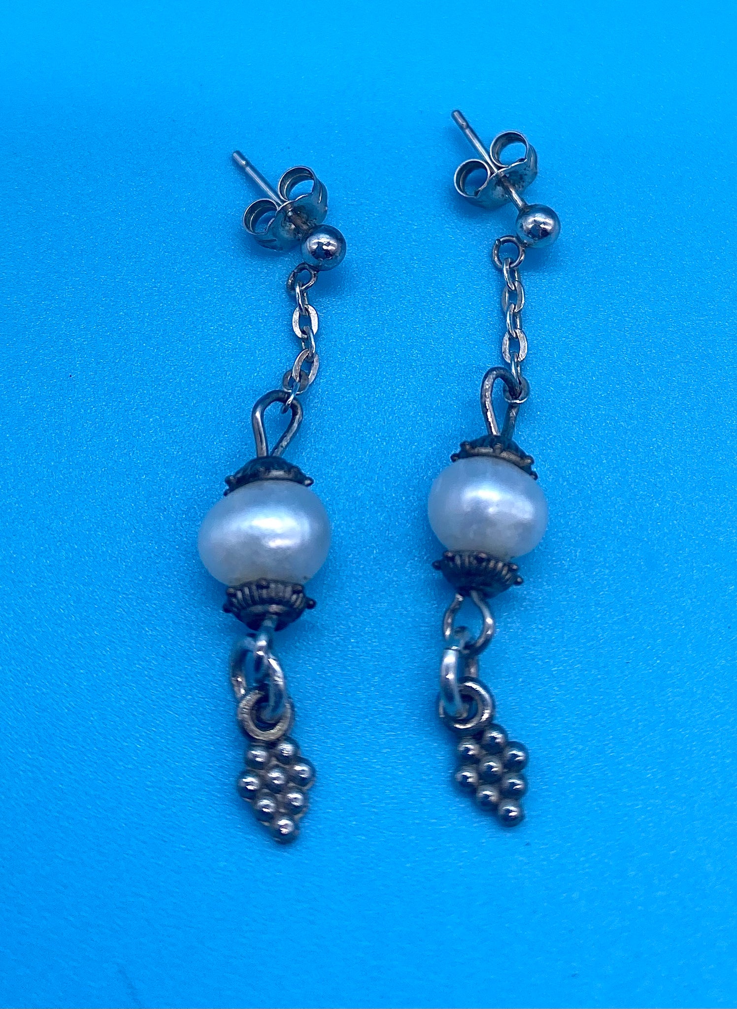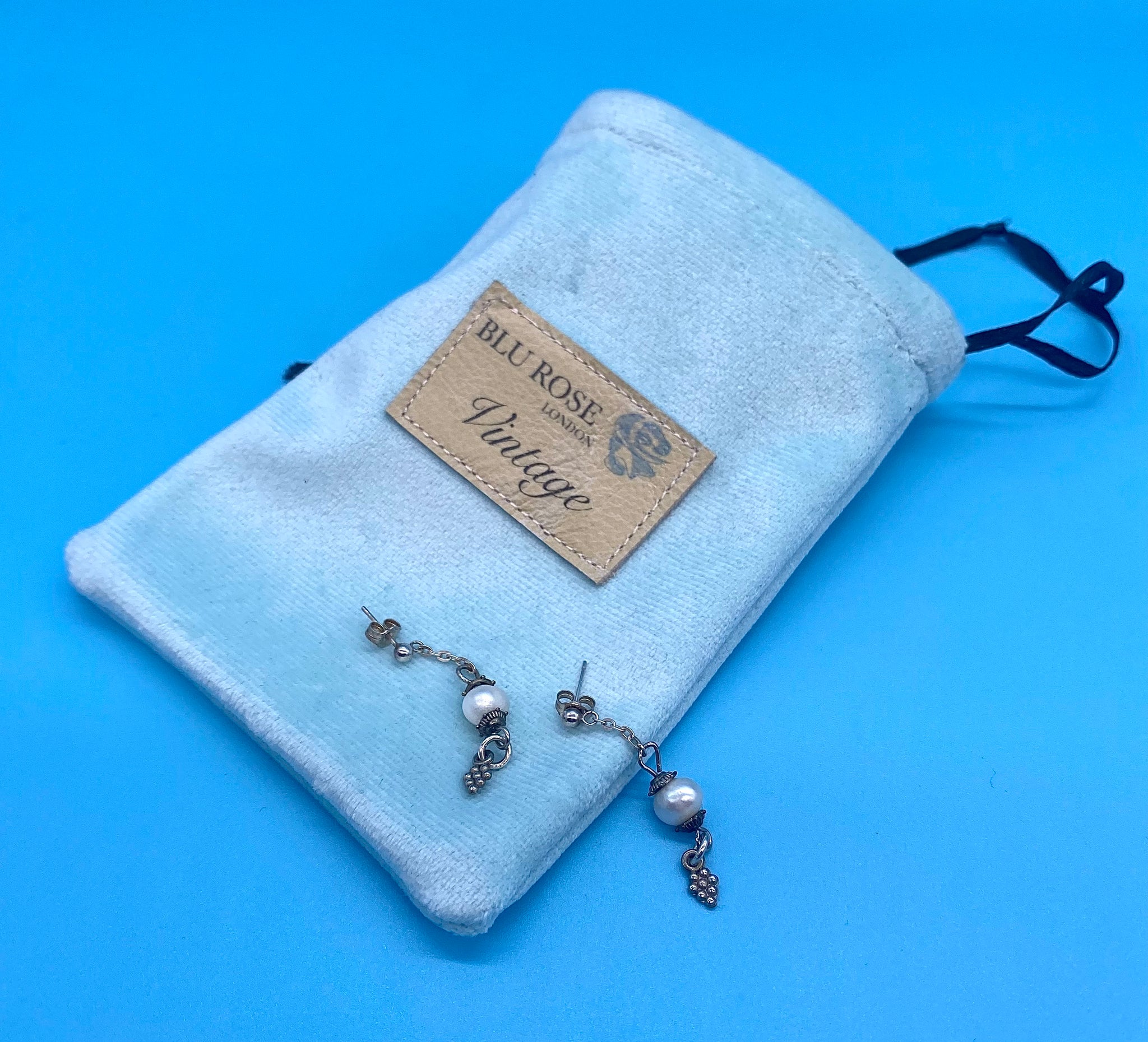 These small pearl drop earrings have been adapted by Blu Rose by adding a small sterling silver chain and a more modern sterling silver stud and butterfly fitting. The small faux pearl is encased in a vintage silver tone setting and a grape like silver tone cluster falls from below the pearl.
