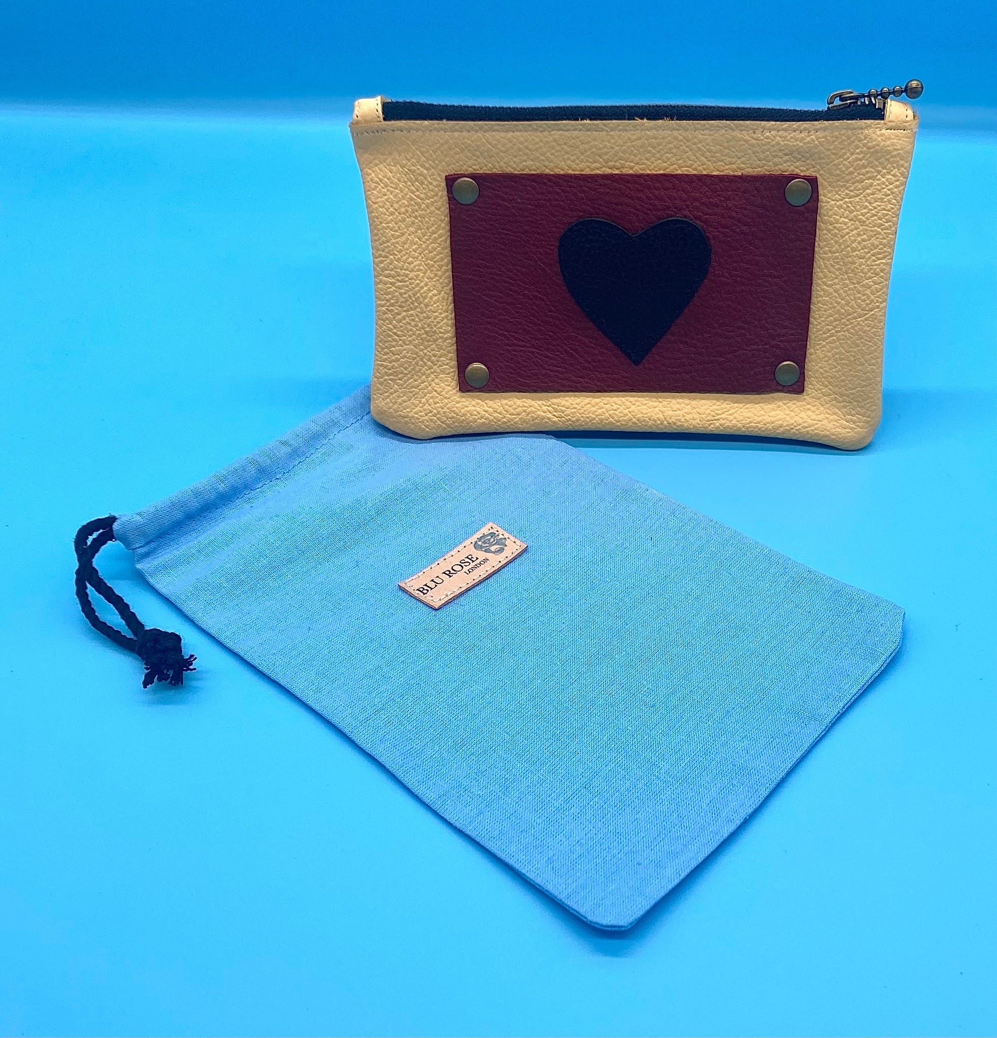 A red leather square with a black leather heart are attached to the front of this pouch finished off with 4 bronze studs.