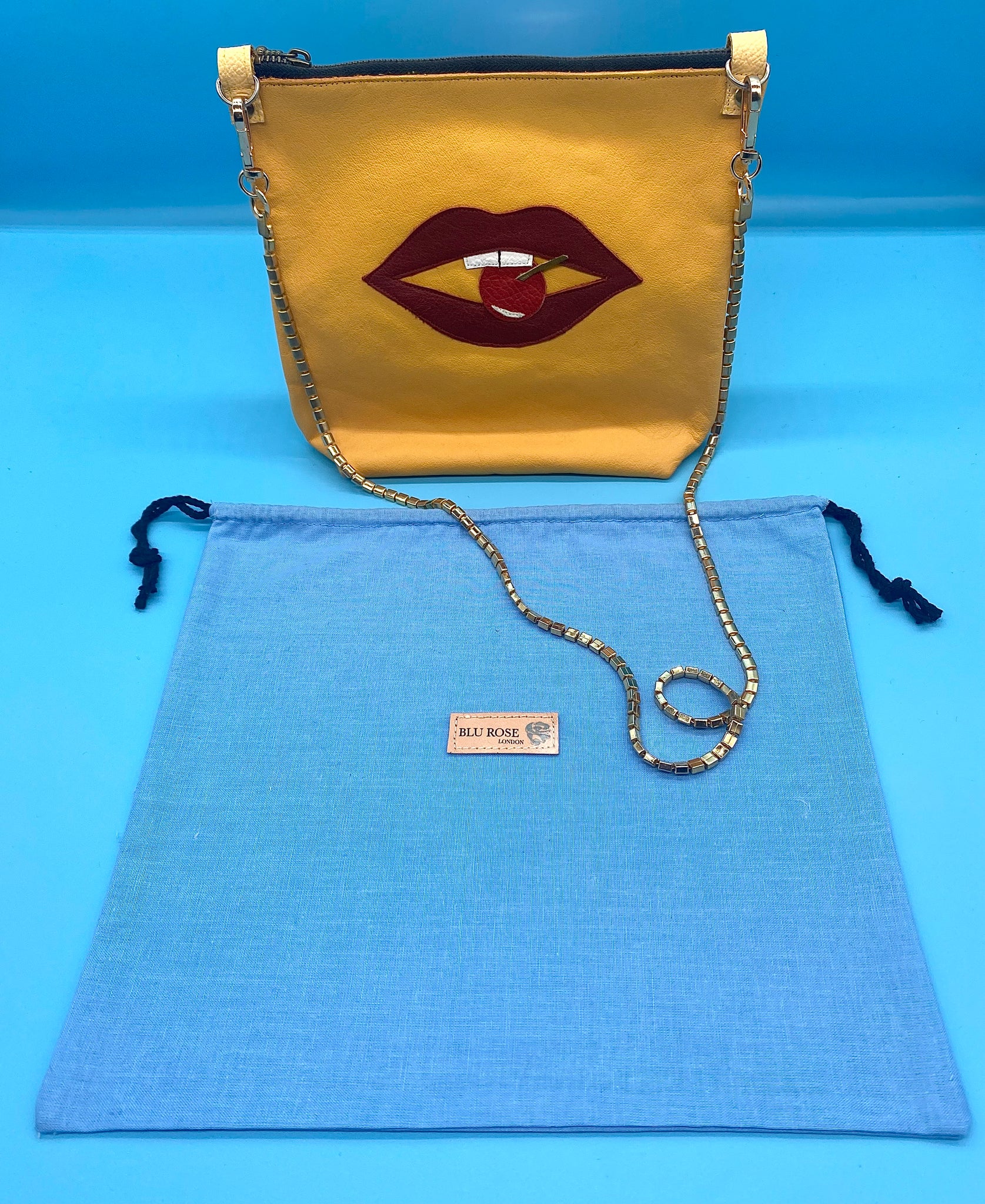 Pop art here we go! You've seen the pouch, well this is the big sis! If a bag is your preference, then this hand crafted yellow leather bag is for you. In the softest of leather it carries a slightly different cherry pop design but with the same detail, everything is hand cut and then attached to the front.